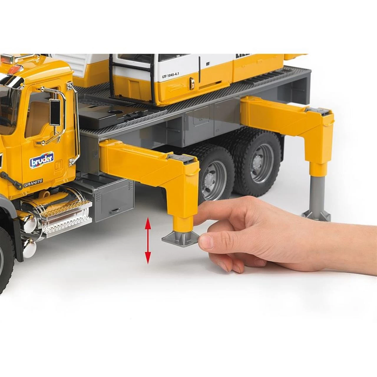 Im wahrsten Sinne des Wortes ragt der imposante Liebherr-Kran LKW aus der BRUDER Range der Nutzfahrzeuge. Der LKW-Kran hat bei ausgefahrener Teleskoplänge bereits eine beachtliche Größe und kann durch einen Zusatzausleger nochmals verlängert werden. Unsere kleinen Kunden werden begeistert sein, denn der Kran ist bei voll ausgebautem und aufgerichtetem Kranarm 1,30 m hoch und wird einige der kleinen Baumeister überragen. Stabilität bei dieser Dimension ist da natürlich ein Muss. Erreicht wird eine hohe Standfestigkeit gegen Kippen durch die schwenkbaren und individuell einstellbaren Stützfüße der Fahrzeugplattform. Für noch mehr Stabilität lässt sich das angebaute Ausgleichsgewicht wie beim Originalkran verwenden. Um für ausreichend Gewicht beim Modell zu sorgen, kann es mit Sand befüllt werden. Der BRUDER Slogan Mulitifunctional wird besonders bei diesem Modell sichtbar. Eine neu entwickelte Seilwinde mit Feststelleinrichtung und Überlastsicherung ermöglicht ein spielend leichtes Handling des Kranhakens beim Heben und Senken, auch von großen Teilen. Die Liebe zum Detail macht auch vor der Kranführerkabine nicht halt. Wie beim Original besitzt sie den Scheibenschutzrahmen und eine zu öffnende Schiebetüre. Ein in die Plattform integriertes Werkzeugfach rundet die vielen Funktionen des Krans ab. Gleichwertig in der Anmutung ist das Mack Fahrerhaus. Mit seinen vielen Chromteilen und der großen Motorhaube verkörpert es den American way of live. Ein Truck mit vielen Funktionen, wie zu öffnender Motorhaube und Türen.