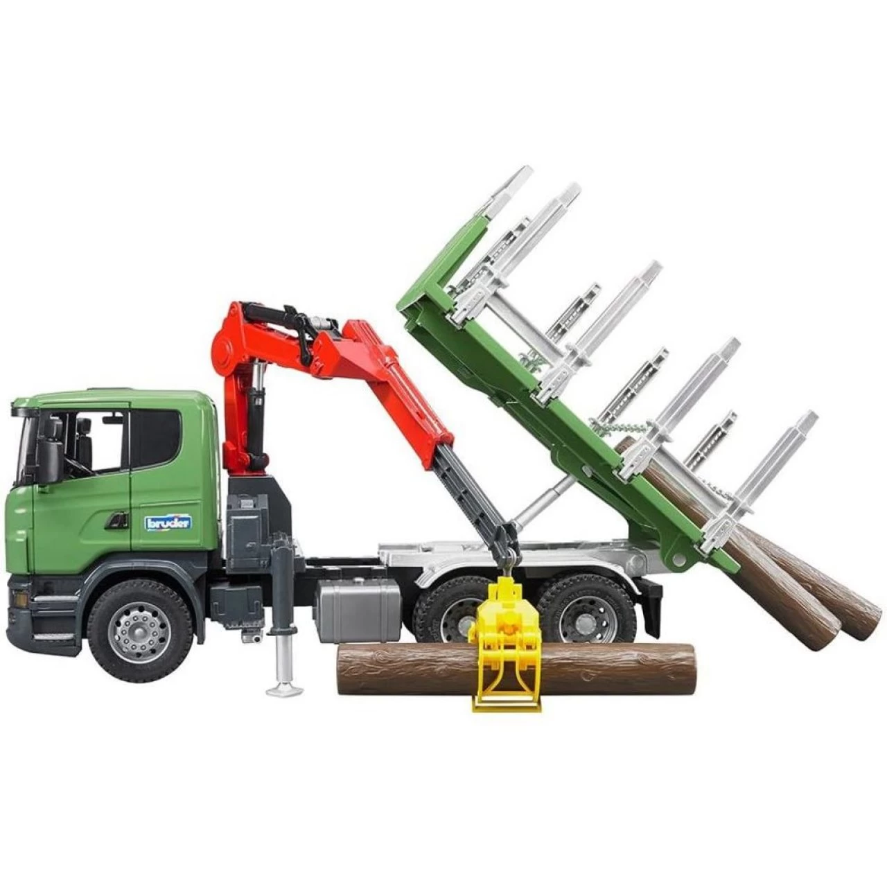 Bruder 03524 – Scania R-Serie Holztransport-Lastkraftwagen mit Ladekran, Greifer und 3 Baumstämmen 1:16