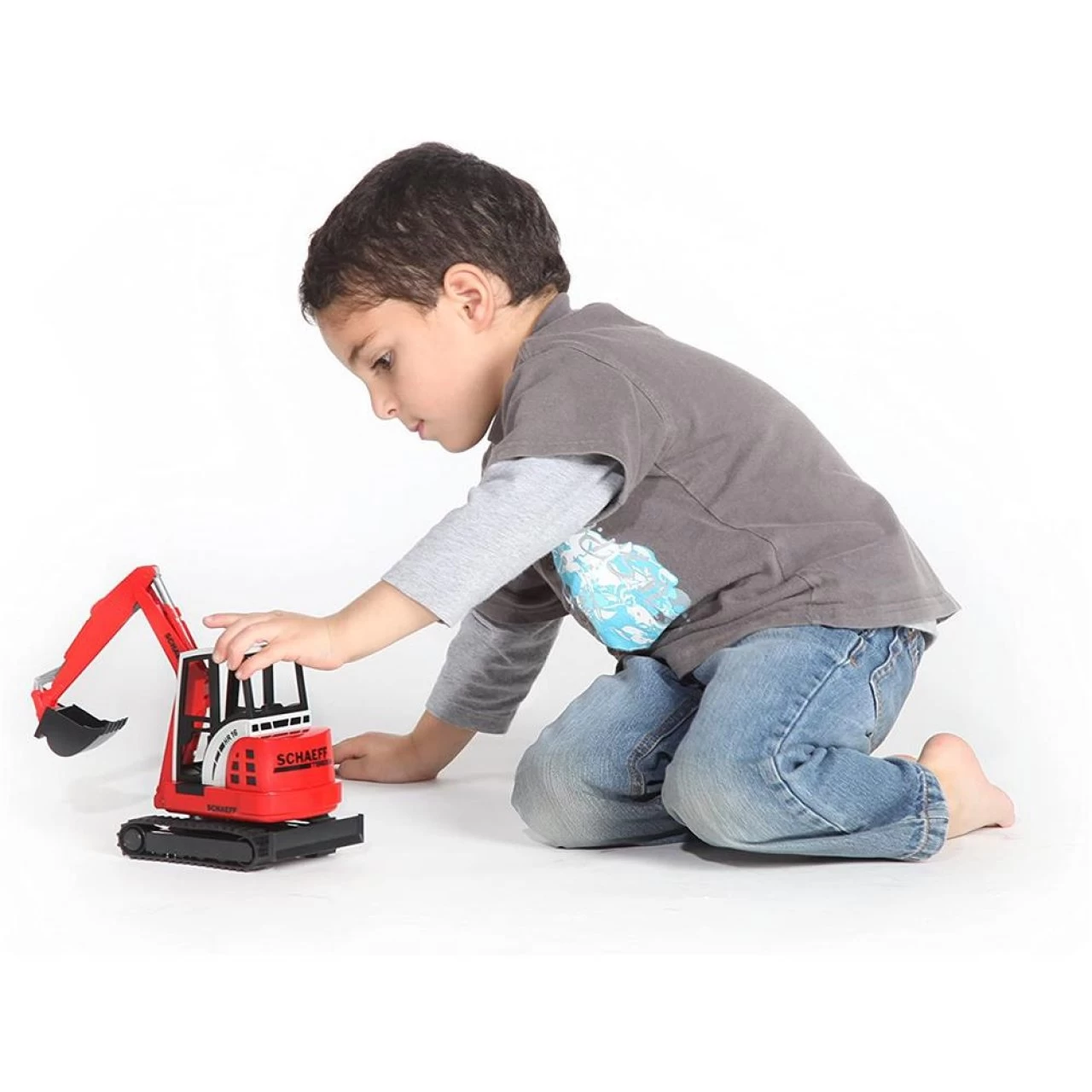 Der Schäff Mini Bagger Hr16 von BRUDER ist klein genug, um durch kleinste Öffnungen zu passen, aber auch stark genug um die Arbeit von zehn Männern zu erledigen. Dabei überzeugt er mit einer sehr detailgetreuen Ausstattung, zu der ein voll funktionsfähiger abnehmbarer Baggerarm, ein um 360° drehbares Fahrerhaus gehört. Ein weiteres Highlight ist das leicht laufende Gummilaufband, das ein spielerisches Manövrieren ermöglicht. Das deutsche Familienunternehmen BRUDER Spielwaren zeichnet sich seit der Gründung im Jahre 1926 durch innovative Produkte, der Liebe zum Detail und dem Erfüllen von Kinderträumen aus. Mit Einführung der Kunststoffproduktion wurde der Weg zum heutigen weltweiten Erfolg der Marke Bruder geebnet. Bruder verwandelt die erlebte reale Welt in eine originalgetreue Kinderspielwelt. Mit dem pädagogischen wertvollen Prinzip können Kinder das Gesehene aufbereiten und werden spielerisch an die verschiedensten Themen, wie den Straßenbau, die Landwirtschaft oder an Rettungseinsätze herangeführt. Dabei überzeugt Bruder durch die hohe Qualität und vielseitige Funktionalität seiner Produkte. Die Slogans „auch im Kleinen wie der Große“ beziehungsweise „Just like the real thing“ spiegeln das Leitbild der Firmenphilosophie wieder. Die geschaffenen Welten lassen sich durch die maßstabsgetreuen Figuren der BWORLD Serie (Bruder Welt) bevölkern und bieten durch den aktiven Einsatz auf Feldern und Baustellen ein grenzenloses Spielvergnügen für Jung und Alt.