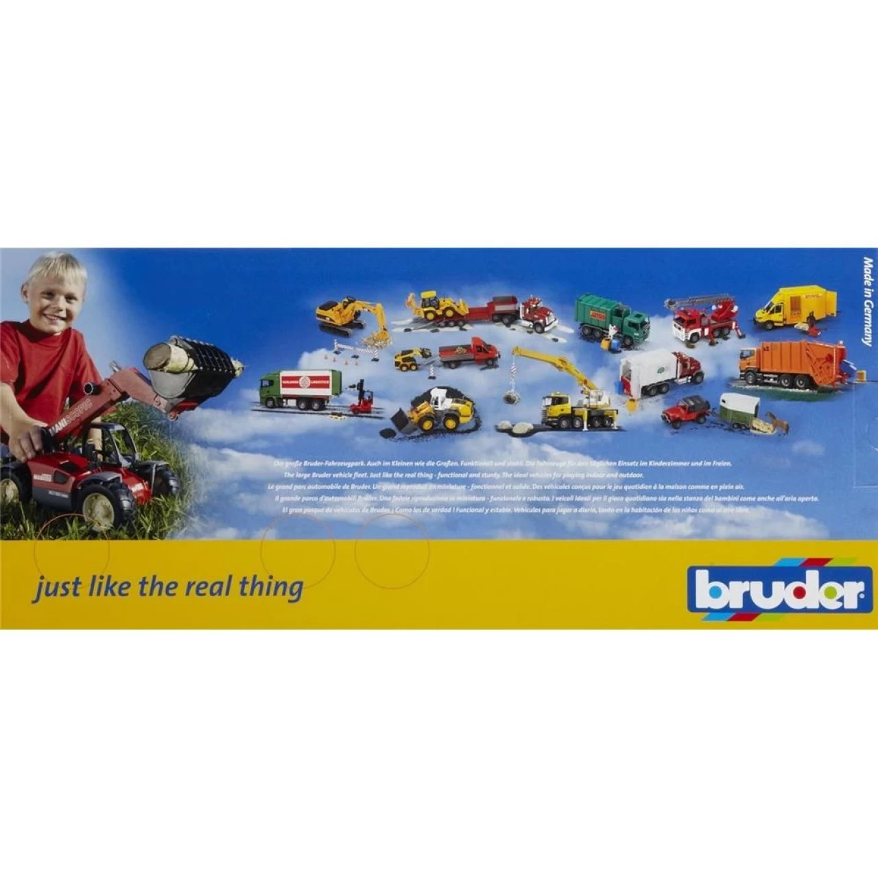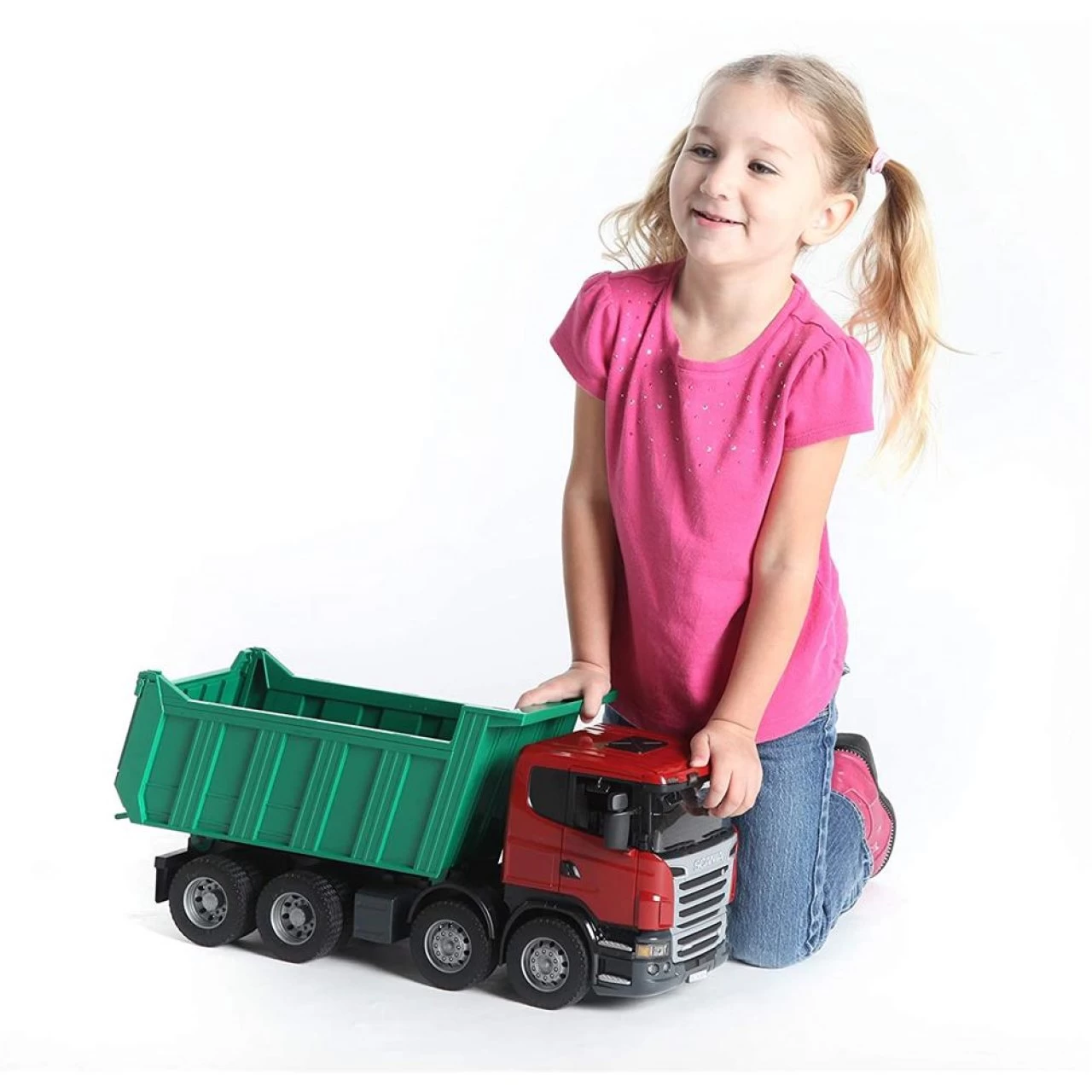Die SCANIA R-SERIE steht für die Symbiose aus Wirtschaftlichkeit, Komfort und Dynamik. Das Fahrerhaus des SCANIA Kipp-LKW spiegelt das elegante und dynamische SCANIA – Design wieder. Die klappbaren Außenspiegel, die zu öffnenden Türen sowie die transparente Verglasung aus hochwertigem Polycarbonat zeichnen das originalgetreue Modell des Fahrerhauses aus. Dieses lässt sich zusätzlich mit dem Licht und Sound Modul für noch mehr Spielspaß erweitern (nicht im Lieferumfang enthalten). Beim Abkippen der Ladung, wird automatisch eine Heckklappe an der Mulde geöffnet. Die 4 robusten Achsen mit den speziellen Profilreifen ermöglichen dem SCANIA Kipp LKW schwere Einsätze. Das deutsche Familienunternehmen BRUDER Spielwaren zeichnet sich seit der Gründung im Jahre 1926 durch innovative Produkte „Made in Germany“, der Liebe zum Detail und dem Erfüllen von Kinderträumen aus. Mit Einführung der Kunststoffproduktion wurde der Weg zum heutigen weltweiten Erfolg der Marke Bruder geebnet. Bruder verwandelt die erlebte reale Welt in eine originalgetreue Kinderspielwelt. Mit dem pädagogischen wertvollen Prinzip können Kinder das Gesehene aufbereiten und werden spielerisch an die verschiedensten Themen, wie den Straßenbau, die Landwirtschaft oder an Rettungseinsätze herangeführt. Dabei überzeugt Bruder durch die hohe Qualität und vielseitige Funktionalität seiner Produkte. Die Slogans „auch im Kleinen wie der Große“ beziehungsweise „Just like the real thing“ spiegeln das Leitbild der Firmenphilosophie wieder. Die geschaffenen Welten lassen sich durch die maßstabsgetreuen Figuren der BWORLD Serie (Bruder Welt) bevölkern und bieten durch den aktiven Einsatz auf Feldern und Baustellen ein grenzenloses Spielvergnügen für Jung und Alt.