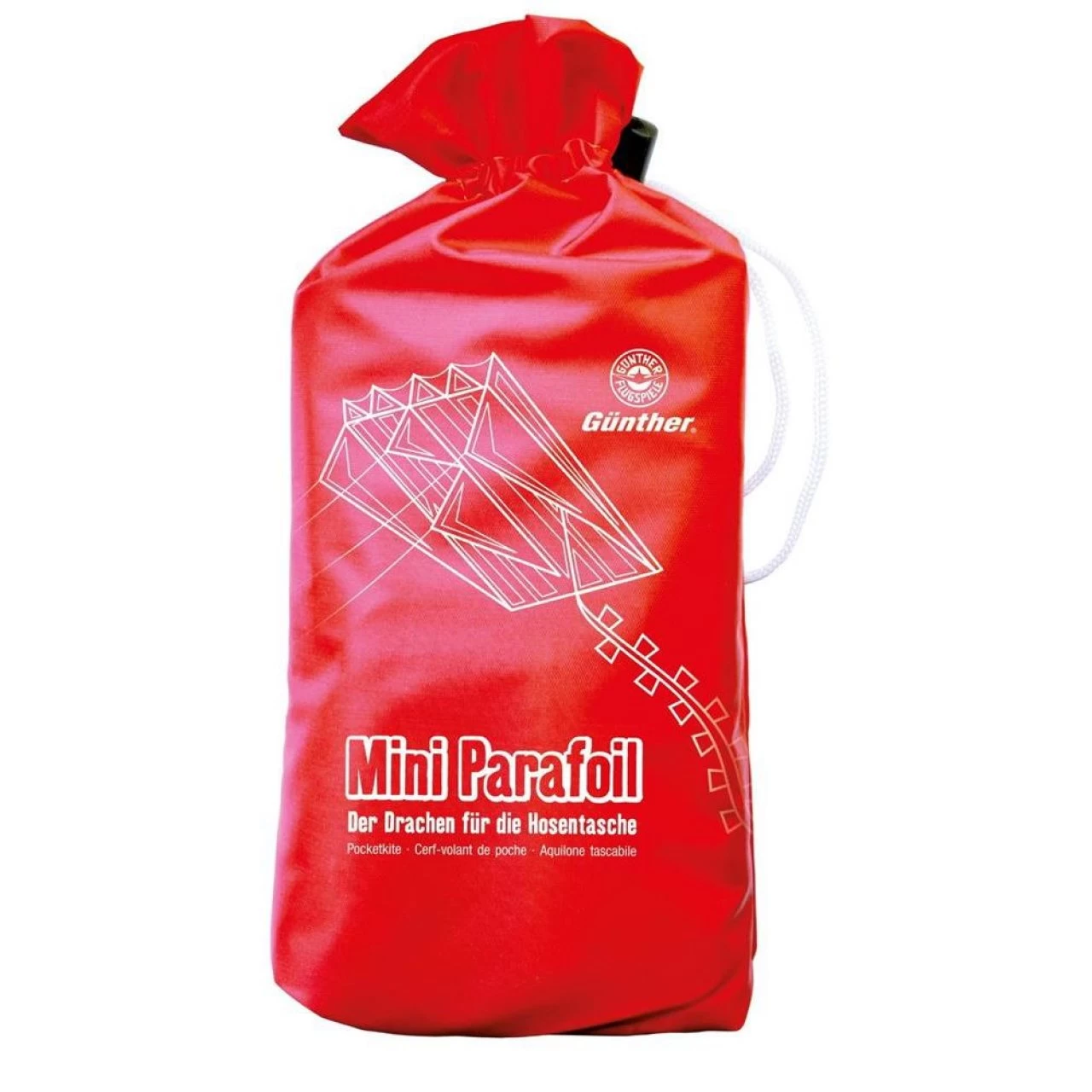 Einleinerdrachen Mini-Parafoil. Der Drachen für die Hosentasche – auspacken und losfliegen. Komplett mit Wickelgriff, Schnur und Schwanz. Keine Stäbe. Größe: ca. 60 x 51 cm. Wind: 12 – 30 km/h. Geeignet ab 6 Jahren.