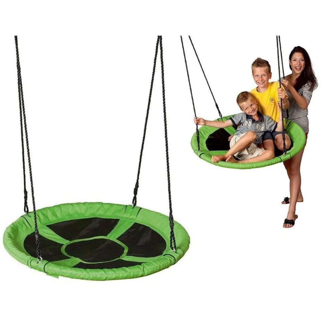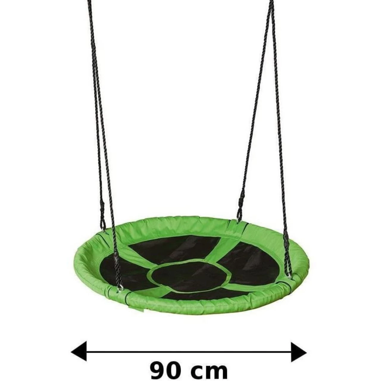 Die Nestschaukel hat einen Durchmesser von 90 cm und hat einen schönen Kontrast aus schwarz und grün. Die Höhe ist bis zu 160 cm verstellbar. Der Sitz wird von 4 Seilen gehalten.
