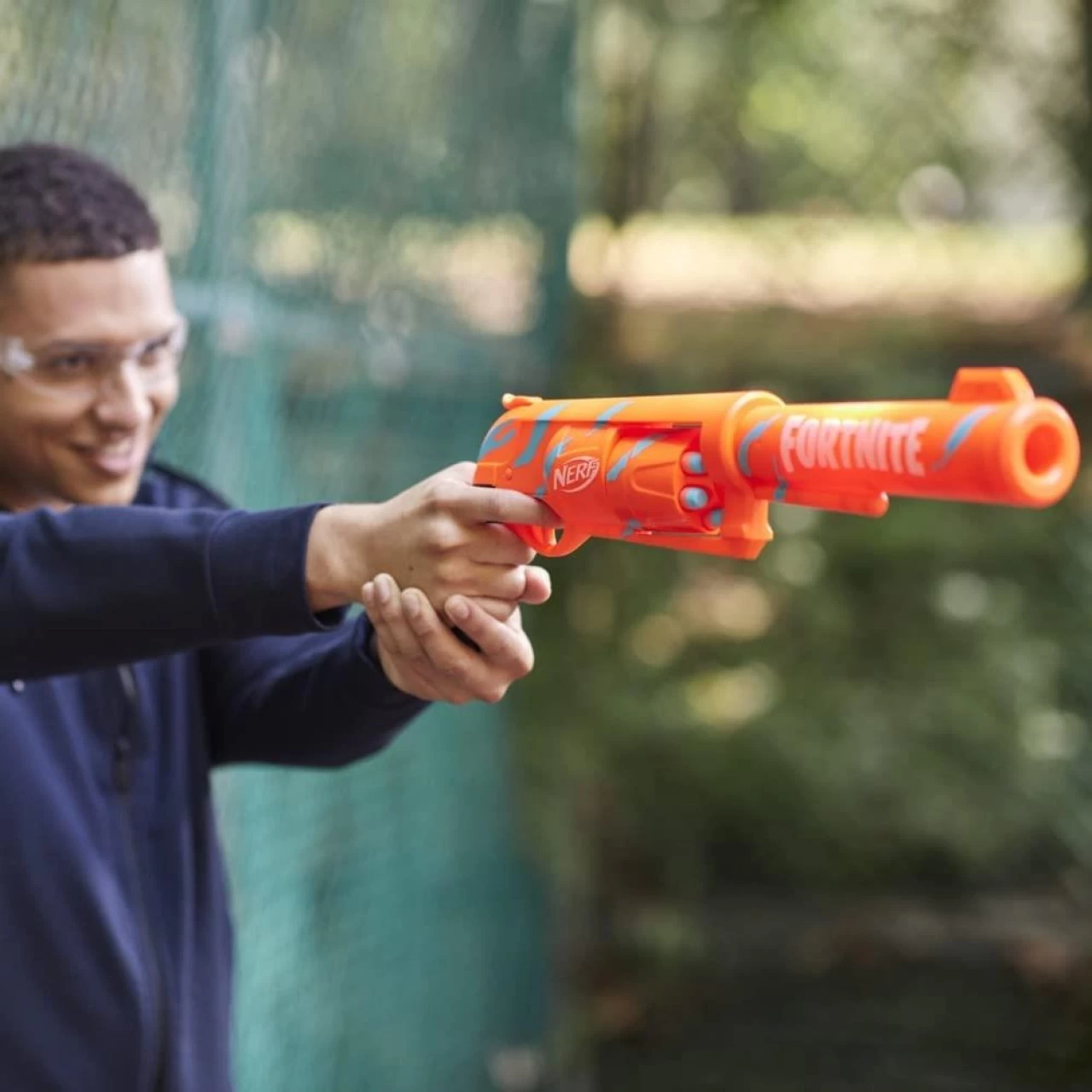 Der Nerf Fortnite 6-SH Blaster ist durch die im Fortnite Videospiel verwendete Ausrüstung inspiriert und hat den Look der Camo Pulse Lackierung aus dem beliebten Videospiel. Der Blaster kommt mit Revolver-Action – durch das Herunterziehen des Spannhebels wird der Blaster auf das Feuern vorbereitet, anschließend wird der Abzug gedrückt, um einen Dart abzufeuern.