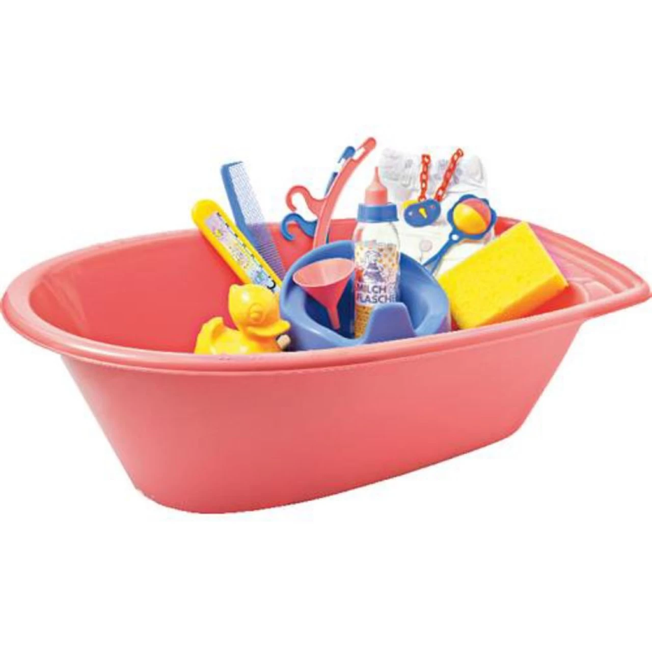 Große Puppenbadewanne mit sehr viel Zubehör für die kleine Puppenmutti zum Baden, zur Pfl ege und zum Füttern ihres Puppenbabys. Grö ße ca. 51x28x16 cm. Ab 3 Jahren.