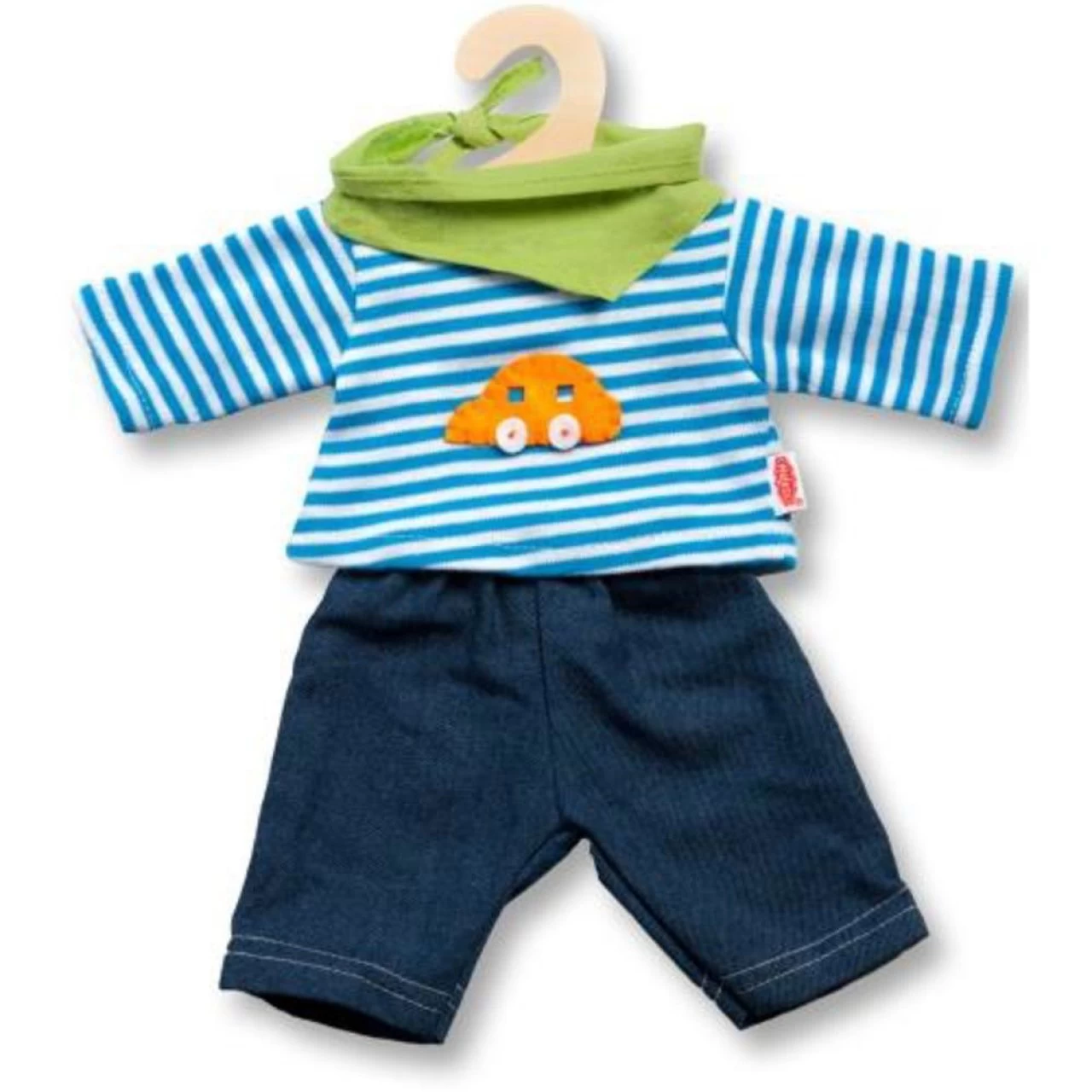 Jeans mit Streifenshirt, Gr. 35-45 cm. Damit unsere Puppenjungs nicht zu kurz kommen ist das Outfit mit welchem Heless Weichpuppen angezogen kommen auch als Bekleidungsset verfügbar. Dieses besteht aus einer Jeans, modernem blau-weißem Streifen-Shirt mit Auto-Applikation und einem grünen Halstuch.