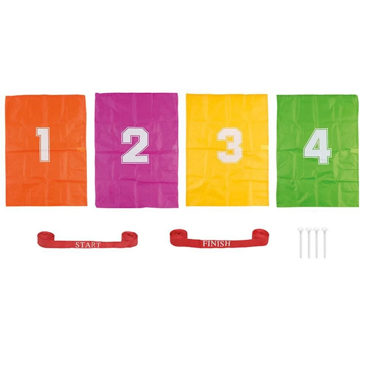 Hüpfsackrennen! Startet gemeinsam an einer Startlinie und versucht als Erstes das Ziel zu erreichen! In diesem Set erhalten Sie vier Hüpfsäcke und eine Startlinie. Jeder Hüpfsack hat eine andere Farbe und ist mit einer Nummer bedruckt. Mit einer Größe von ca. 72 x 52 cm sind die Hüpfsäcke für Kinder ab 3 Jahren geeignet.