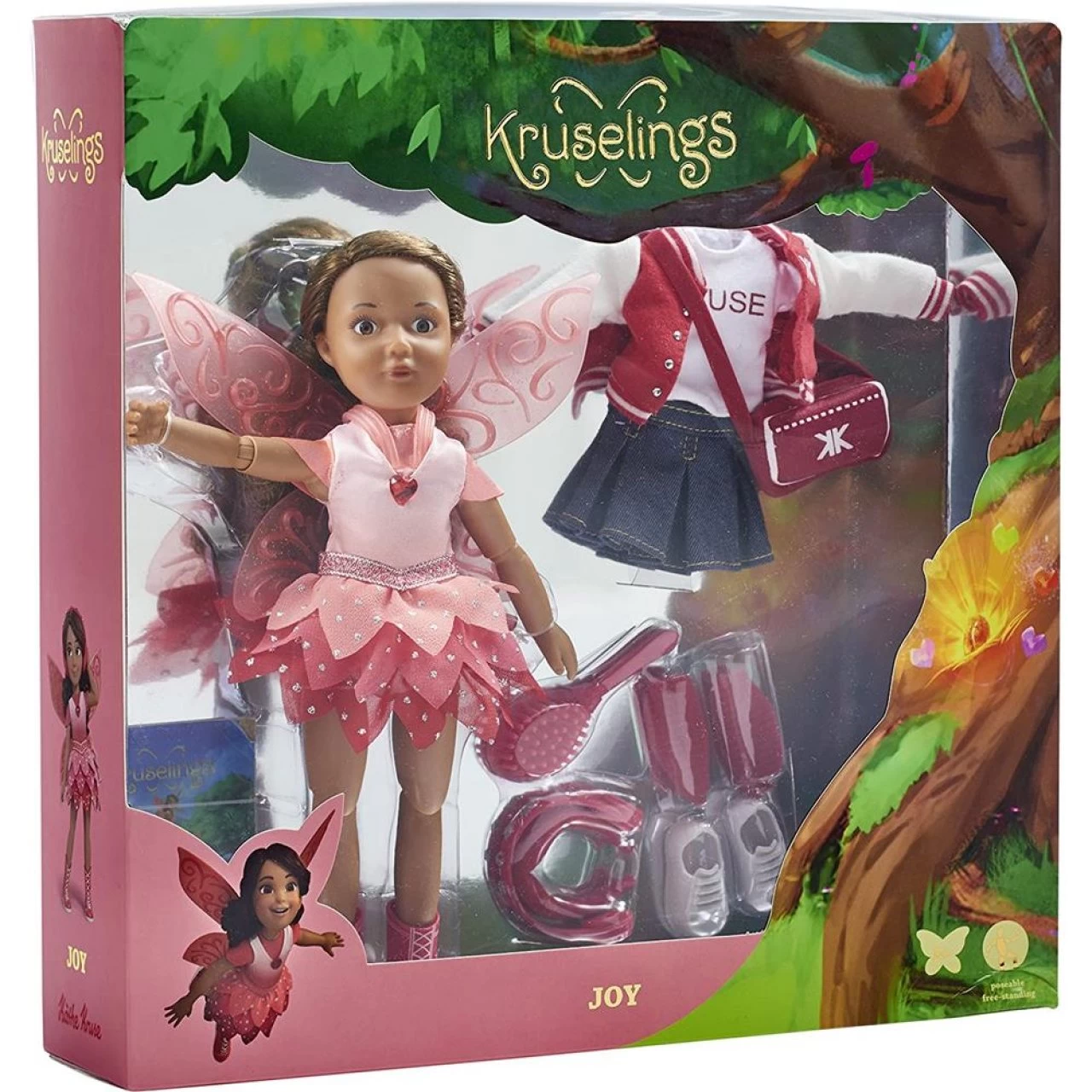 Joy hat braune lockige Haare und braune Augen. Sie trägt ein rotes Kleid und hat ihre Stiefel, Flügel und ihre magischen Kopfhörer dabei. Ihre Alltagskleidung besteht aus einem T-Shirt, Jeansrock und einer Collegejacke, dazu weiße Sneakers und eine Sporttasche. Sie bringt für ihre Haare ihre eigene Haarbürste mit. Puppe aus hochwertigem Vinyl, mit beweglichen Gelenken und lebensecht aussehenden Glasaugen.