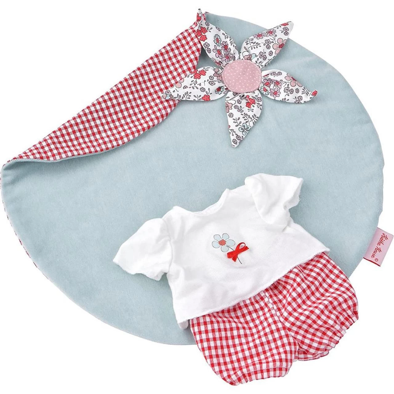 Die Spieldecke ist auf der Vorderseite aus weichem Nickystoff und einer aufgenähten Blüte mit Rascheleffekt. Die Rückseite ist aus rot-weiß karierten Baumwollstoff. Ebenfalls dazu gehört das Sommeroutfit, bestehend aus einem weißen Oberteil mit Blumendruck und einem rot-weiß karierten kurzen Höschen.