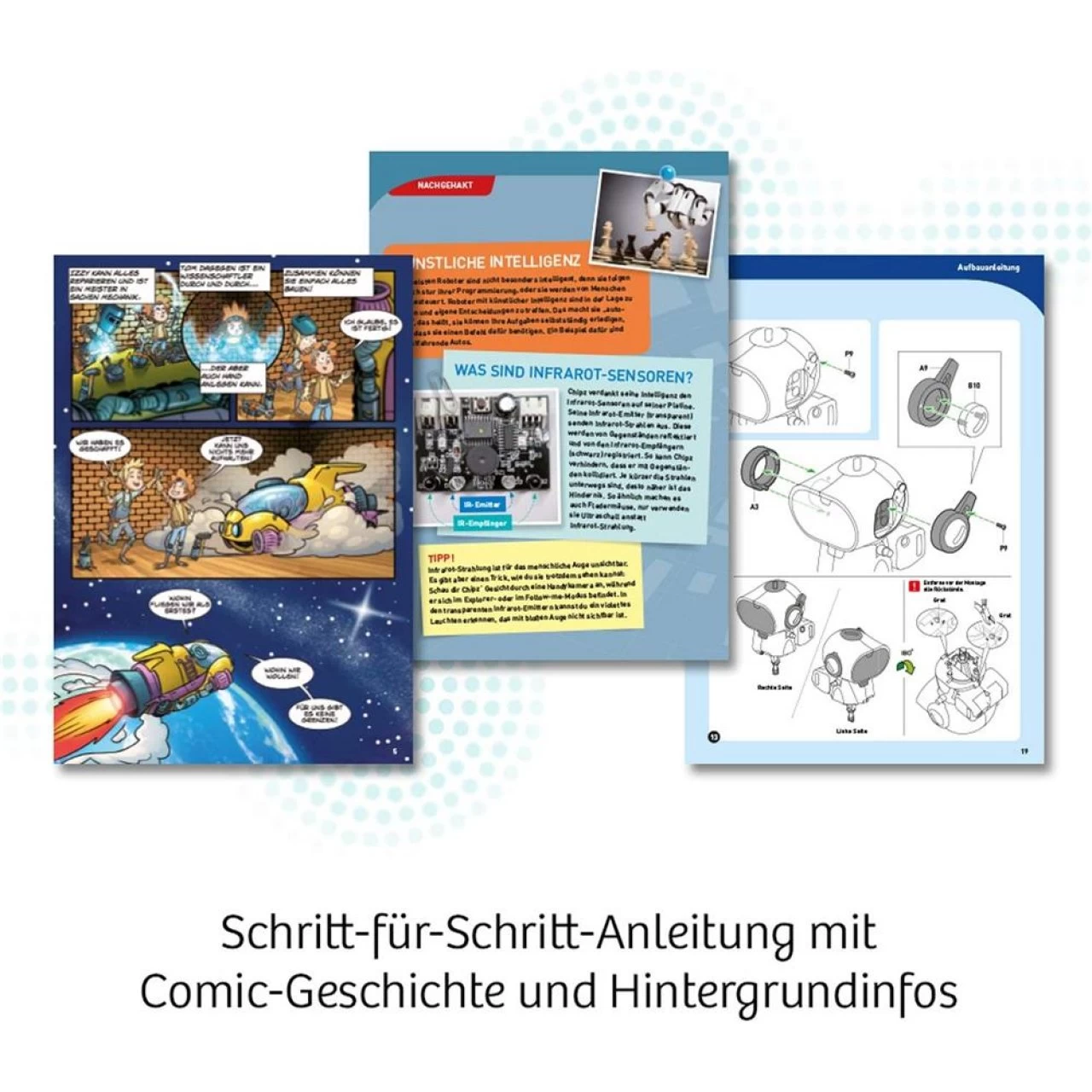 - Inhalt: Bauteile zum Zusammenbau des Roboters, Vorprogrammierte Platine mit Infrarot-Sensoren, Schraubendreher, Anleitung