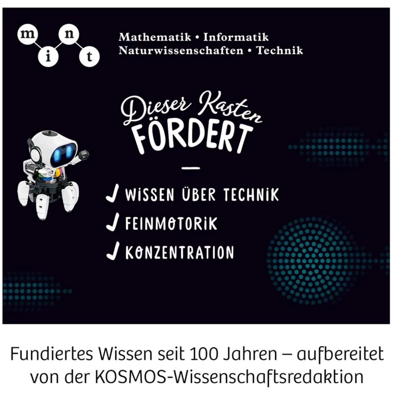 Ein Hightech-Freund mit intelligenten Funktionen Hier kommt Chipz, der clevere Roboter auf 6 Beinen! Mit seinen unterschiedlichen Sensoren und Spiel-Modi ist er in der Lage, Objekte zu erkennen und ihnen zu folgen sowie Hindernissen auszuweichen. Dank der durchdachten Konstruktion lassen sich die über 100 Teile einfach zusammenbauen und sorgen so für großen Bauspaß. Ein KOSMOS Experimentierkasten für Roboter-Fans von 8 bis 14 Jahren. Inhalt: Bauteile zum Zusammenbau des Roboters, Vorprogrammierte Platine mit Infrarot-Sensoren, Schraubendreher, Anleitung Zusätzlich wird benötigt: 4 x 1,5-Volt-Batterien Typ LR03
