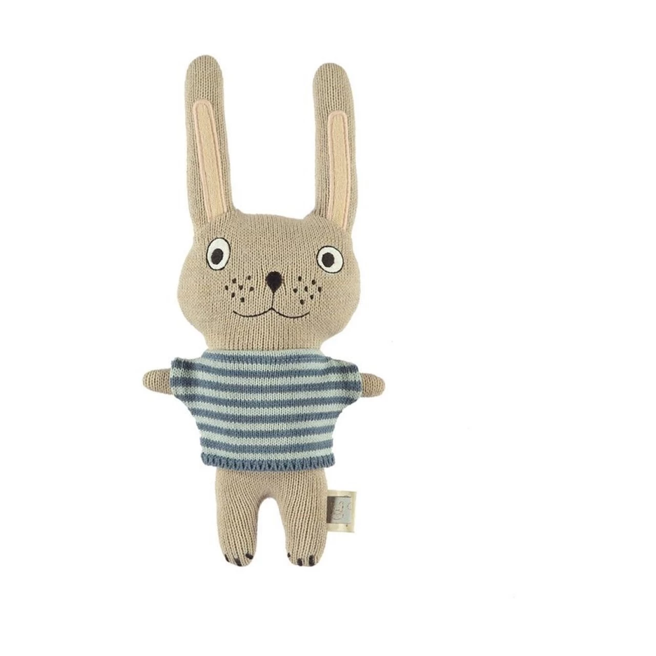 Der Baby Felix Rabbit ist aus 100% Baumwolle, Jacquard gestrickt, und hat eine weiche Faserfüllung, die ihn sehr angenehm zum Kuscheln macht.
