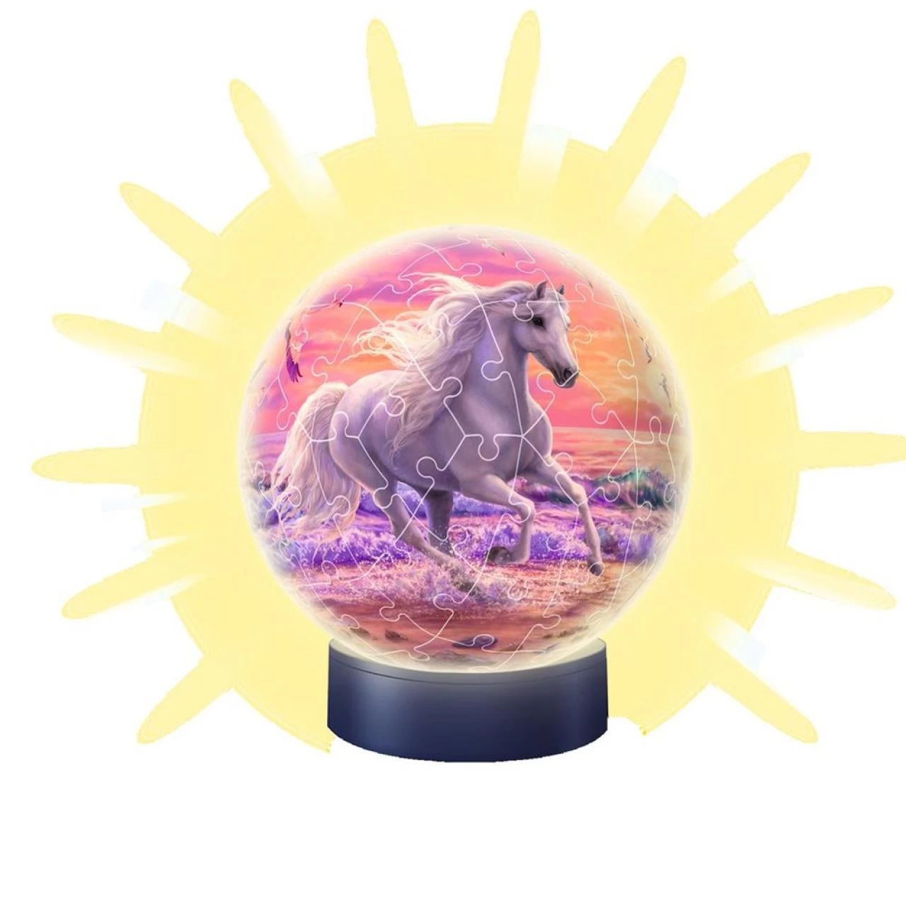 Pferdeliebhaber aufgepasst! Dieser 3D Puzzle-Ball wird mit einem Händeklatschen zum romantischen Nachtlicht, wenn der Leuchtsockel den Ball von innen erstrahlen lässt. Dank unserer Easyclick Technology passen alle Kunststoff-Puzzleteile perfekt ineinander und formen eine stabile Kugel, ganz ohne Kleben. Die Nummerierung der Teile erleichtert das Vorsortieren und ermöglicht einfaches Puzzeln nach Zahlen.