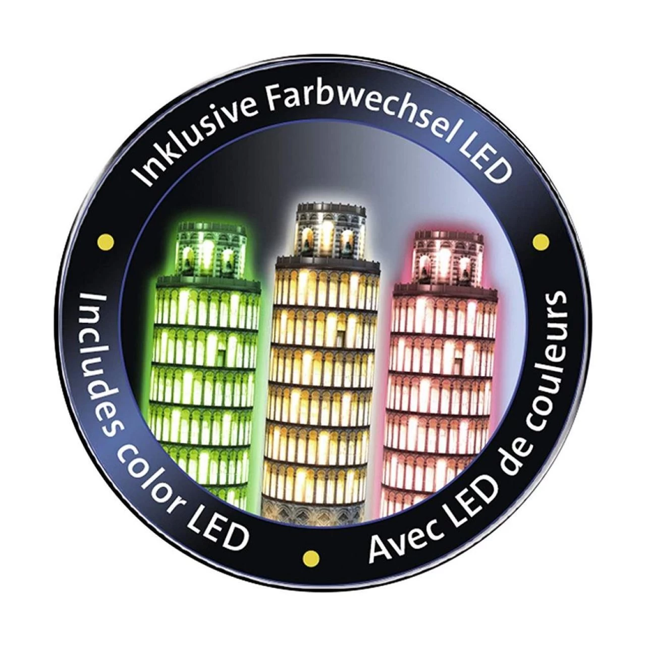 Wer sich daran macht, die 216 nummerierten, individuell geformten Puzzleteile und die Zubehörteile aus stabilem Kunststoff zusammenzusetzen, bekommt eine Ahnung davon, welche Anstrengungen ab 1173 nötig waren, um dieses weltweit einmalige Gebäude zu erschaffen. Und wer hätte damals geahnt, dass der riesige Turm um sage und schreibe 4,5 Meter in Schieflage geraten würde? Genau diese Faszination macht sich breit, wenn eifrige Puzzler den Turm als 3D Puzzle nachbauen. Der Clou ist das im Set inkludierte Leuchtmodul. Die LED-Leuchten lassen das imposante Bauwerk wahlweise in milchigem Weiß oder in kräftigem Farblicht erstrahlen. Ein Effekt, der die herausragende Ausstrahlung dieses Ausnahmebauwerks noch einmal betont und ihn zum Blickfang in jedem Zimmer werden lässt – vor allem, wenn es dunkel ist. So wird die ganze Strahlkraft seiner herausragenden Architektur – und natürlich seiner verblüffenden Schieflage – jeden Tag in den eigenen vier Wänden erlebbar.