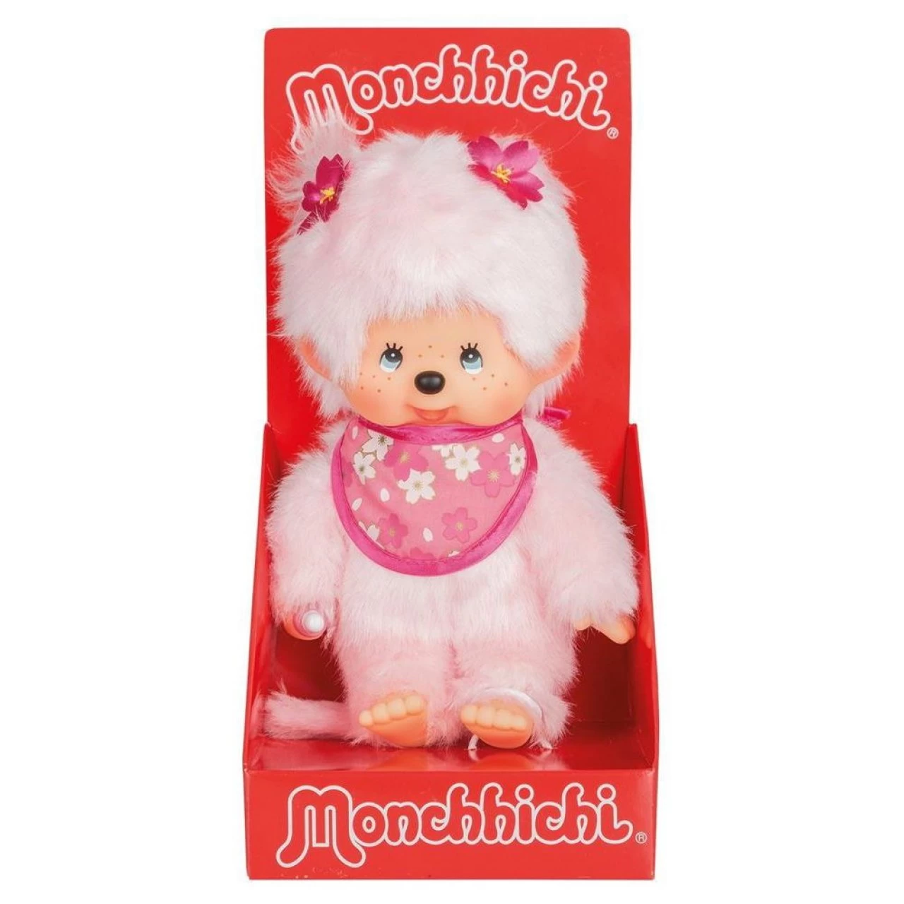 Ein Klassiker in jedem Kinderzimmer und ein Muss für jeden Fan. Dieses süße Monchhichi Mädchen hat rosafarbenes Fell, ein pinkes Lätzchen und pinke Schleifen im Haar. Sie ist ca. 20 cm groß und ist aus Mohair Plüsch hergestellt. In ihrer rechten Hand trägt sie den typischen Schnuller, den sie auch in den Mund stecken kann.