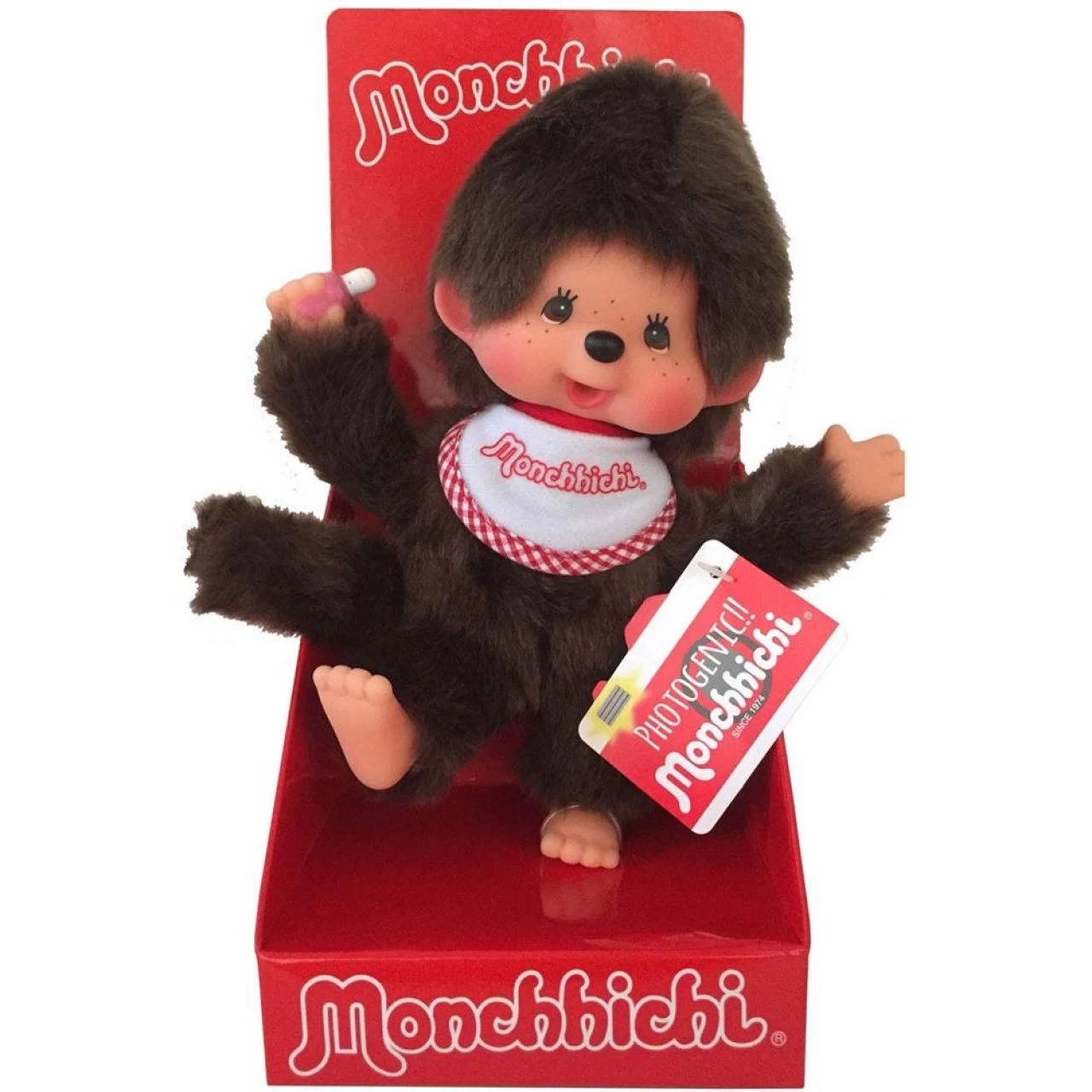 Ein Klassiker in jedem Kinderzimmer und ein Muss für jeden Fan. Dieser süße Monchhichi trägt ein rot weißes Lätzchen zum Abnehmen. Der zauberhafte Junge ist ca. 20 cm groß. Er besteht aus hochwertigem Mohair Plüsch. Ein tolles Geschenk für Jung und Alt.
