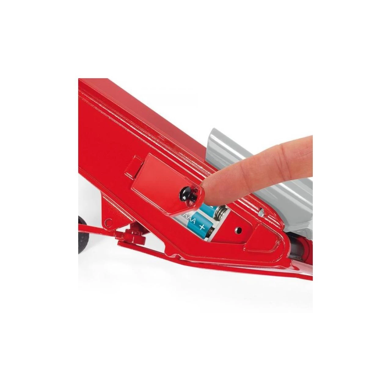 Das batteriebetriebene Förderband (2x Batterietyp AAA) wird durch einen einfachen An/Aus-Schalter aktiviert. Das Fördern des Materials erfolgt nur in eine Richtung vom Bunker weg nach oben bzw. hinten (je nach Winkelstellung des Bandes). Durch die Verstellmöglichkeit des Winkels ist es möglich, durch mehrere hintereinander gestellte Förderbänder eine Förderbandstrecke aufzubauen. Die Befüllung des Bandes erfolgt über einen Trichter, in den Material aus SIKU-Anhängern gekippt werden kann. Trichter und Ein-Achs-Fahrgestell mit Deichsel sind aus Metall. Der Rahmen um das Förderband ist aus Kunststoff. Zum Transport kann das Förderband in eine waagerechte Position gestellt werden. Mit der Deichsel kann es nun an jeden SIKU-Traktor gehängt und zu einem neuen Einsatzort transportiert werden.