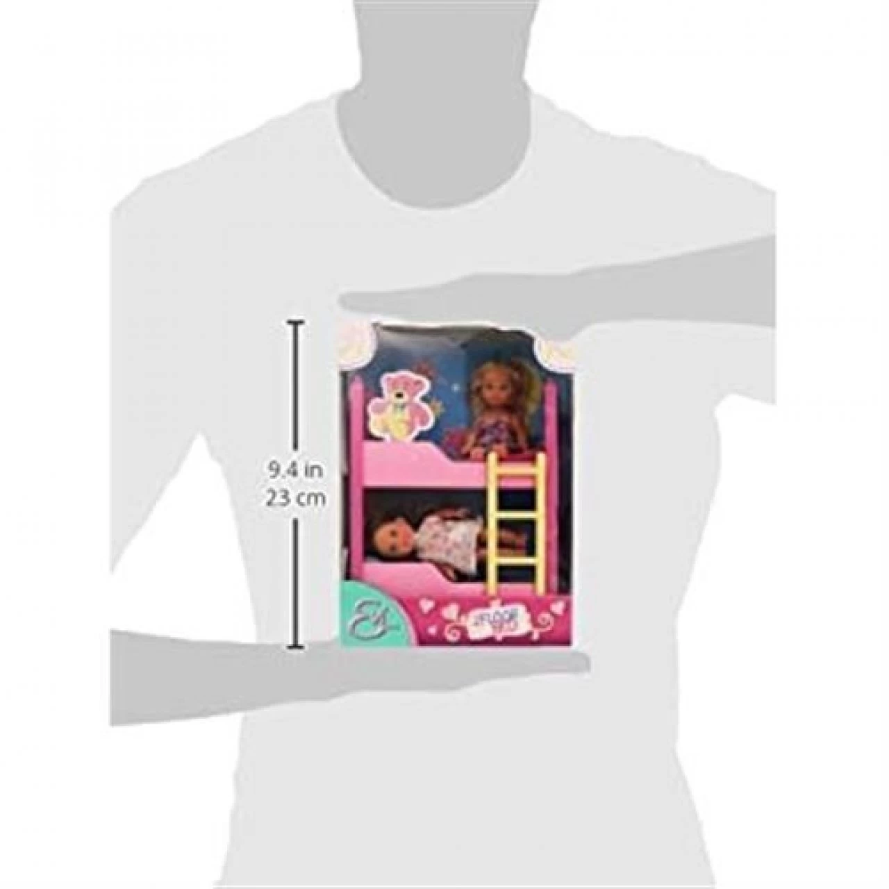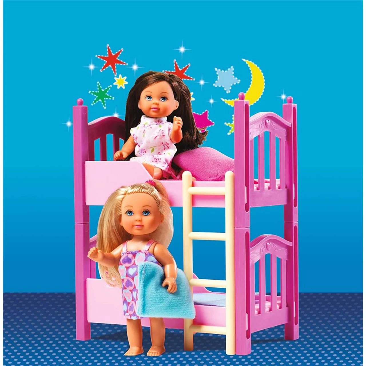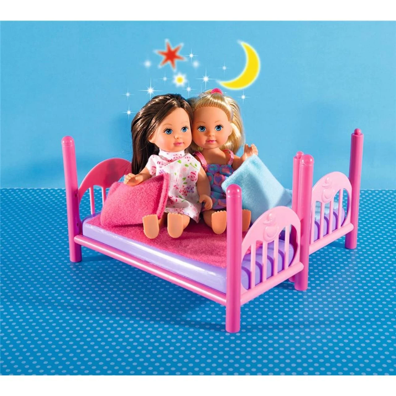- Zwei Evi Puppen – im Set sind zwei Evi Puppen im süßen Nachthemd enthalten. Eine Evi Puppe besitzt blondes Haar, die zweite Evi ist braunhaarig. Beide Puppen sind 12cm groß