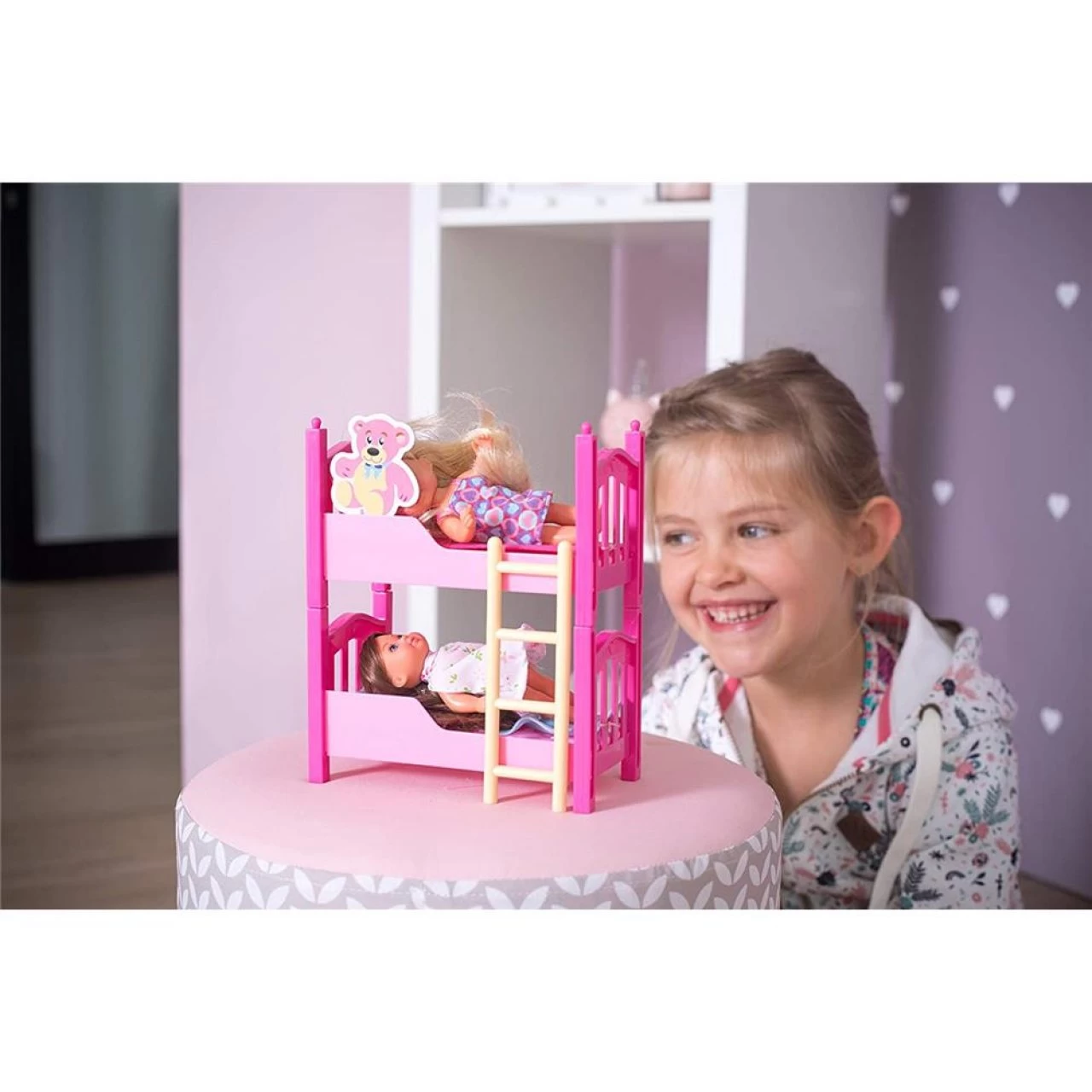 - Rosa Stockbett mit Zubehör – im Set ist ein rosa Stockbett enthalten, in das Mädchen ihre Puppen zum Schlafen legen können. Mit den zwei Kissen und Decken können es sich die Puppen bequem machen. Das Stockbett lässt sich leicht zu zwei Einzelbetten auseinander stecken