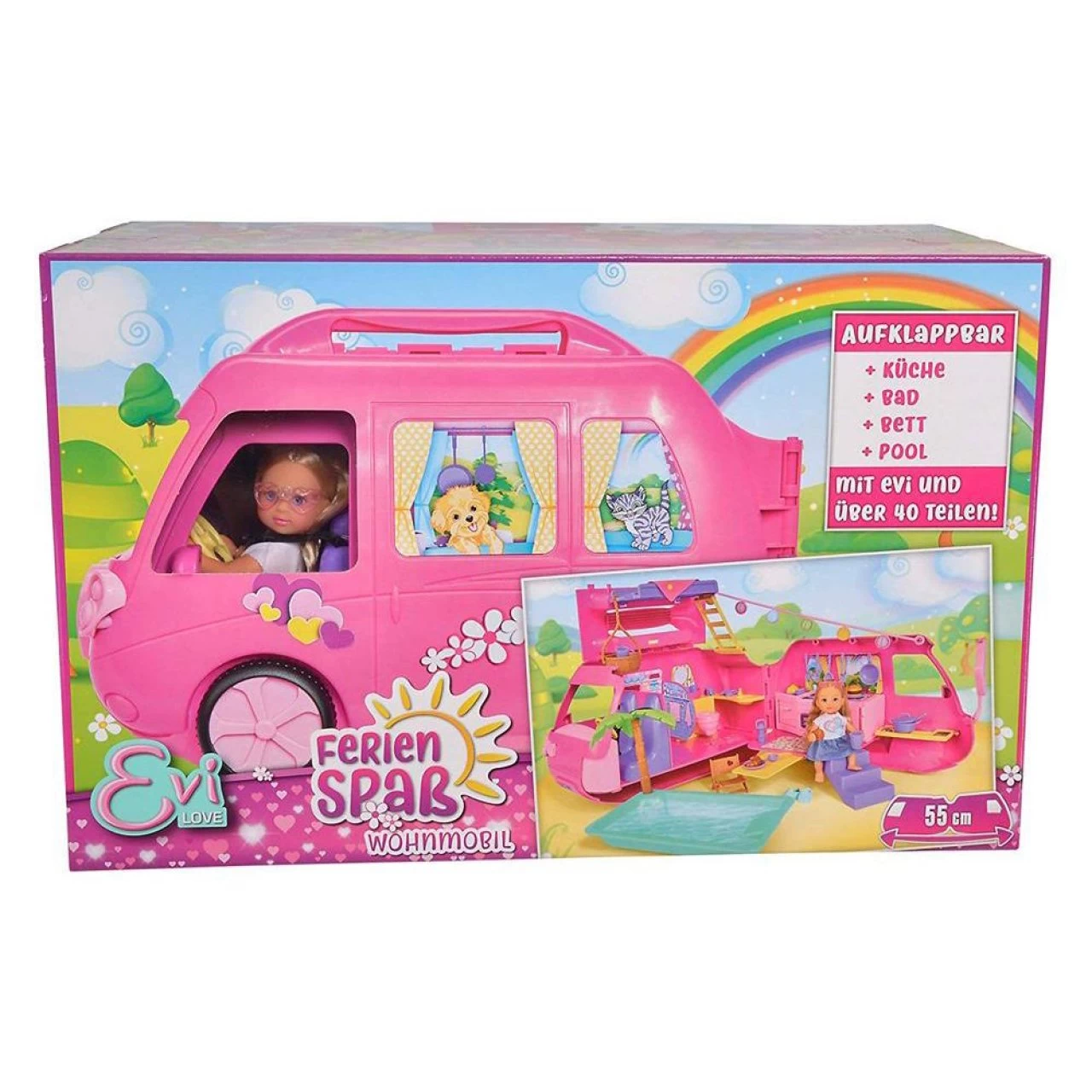 - Evi’s aufklappbares Wohnmobil, inkl. Bett, Küche, Bad, Pool und viel Zubehör