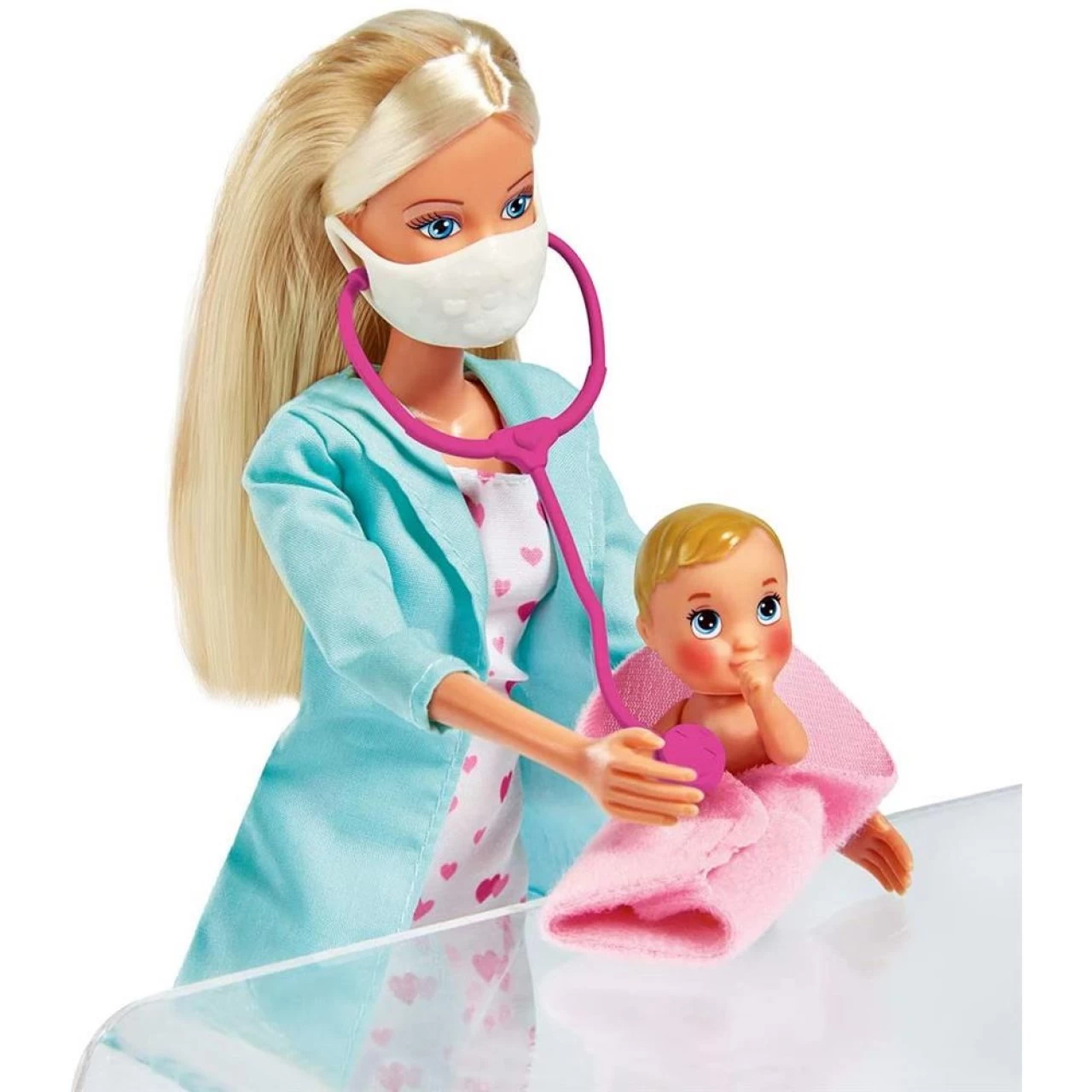 - Steffi als Kinderärztin – Steffi arbeitet als Kinderärztin und trägt einen Kittel und Mundschutz. Ihr Patient ist ein kleines Baby, das Fieber hat. Mit dem Stethoskop kann sie das Baby abhören und mit dem Zubehör verarzten. Die Puppe ist 29cm groß.