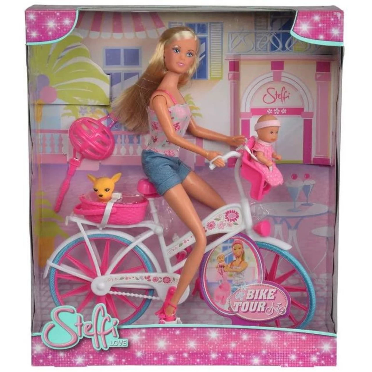 - Mit Fahrrad und Zubehör – neben der 29cm großen Steffi Puppe ist im Set auch ein weißes Fahrrad enthalten. Auf dem Gepäckträger kann Steffi ihren Hundekorb und am Lenker ihren Babysitz befestigen. Somit kann sie ihren Hund und ihr Baby mit auf ihre Spritztour nehmen