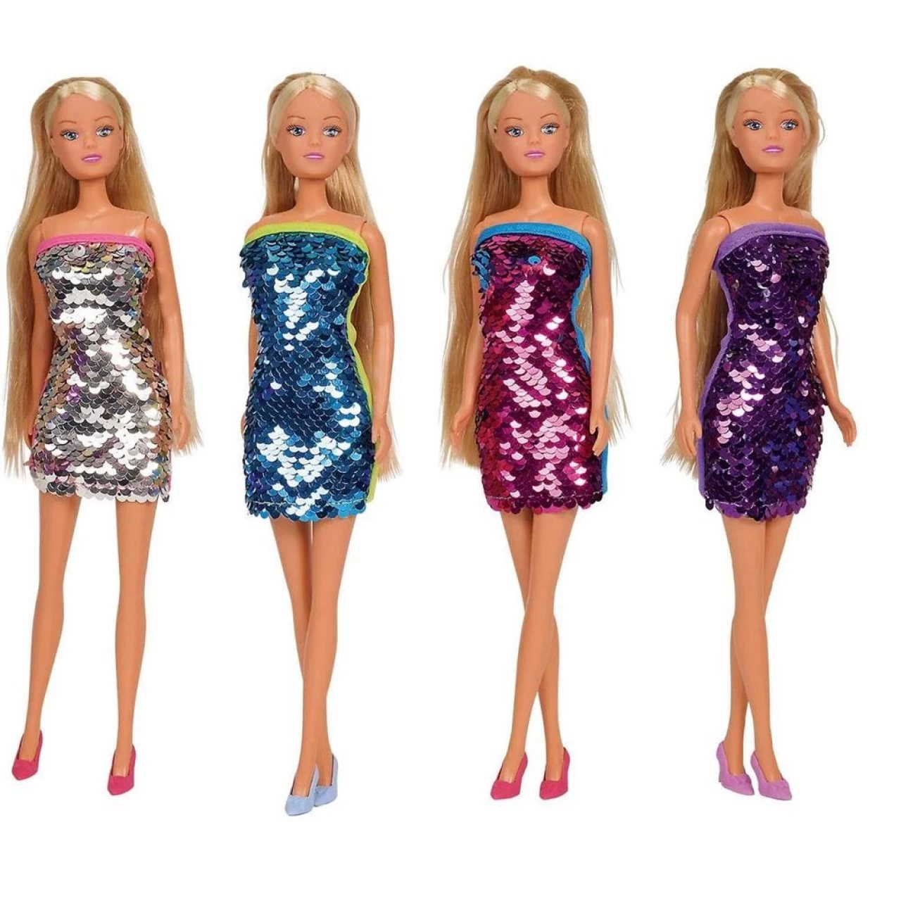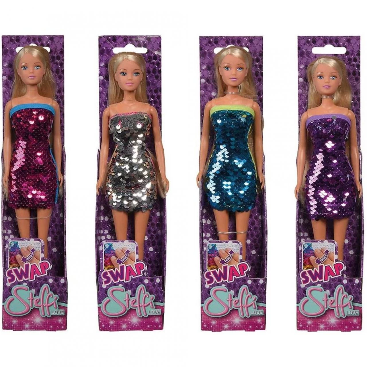 Swap it. Steffi trägt ein atemberaubendes Paillettenkleid mit Swap-Effekt. Streicht man mit den Händen über die Pailletten, so ändern diese ihre Farbe. Somit kann Steffi zwei Looks mit nur einem Kleid tragen. Zu beiden Kleidern kombiniert die Fashionista tolle High Heels. Die Steffi LOVE Swap von Simba Toys ist 29 cm groß und für Kinder ab 3 Jahren geeignet.