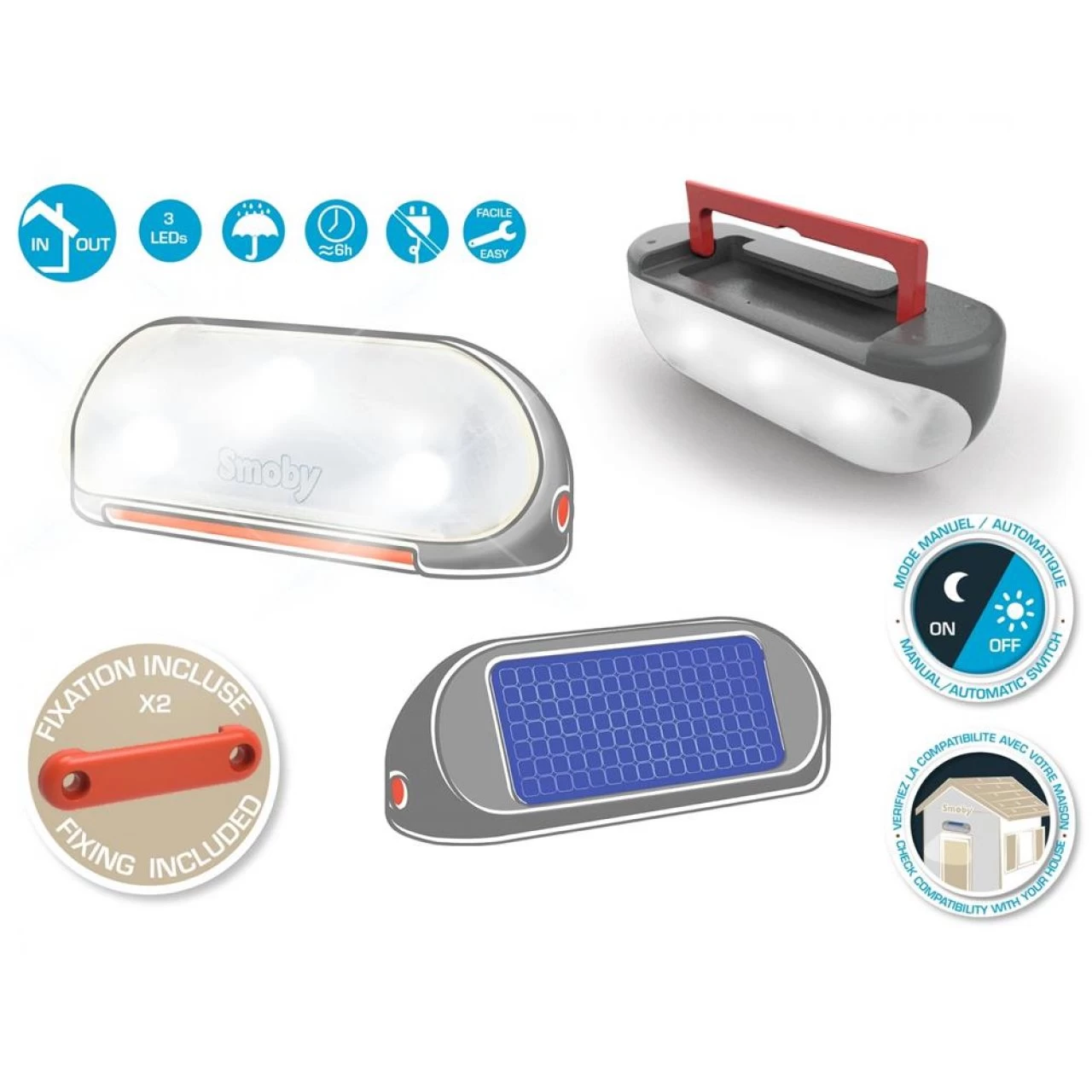 Die outdoorgeeignete Smoby Solarlampe mit Tragegriff ergänzt als Innen- oder Außenbeleuchtung die Smoby Spielhäuser Chef Haus, Gartenhaus, Mein Neues Haus und der Neo Linie: Neo Jura Lodge, Mein Neo Haus und Neo Friends Haus.