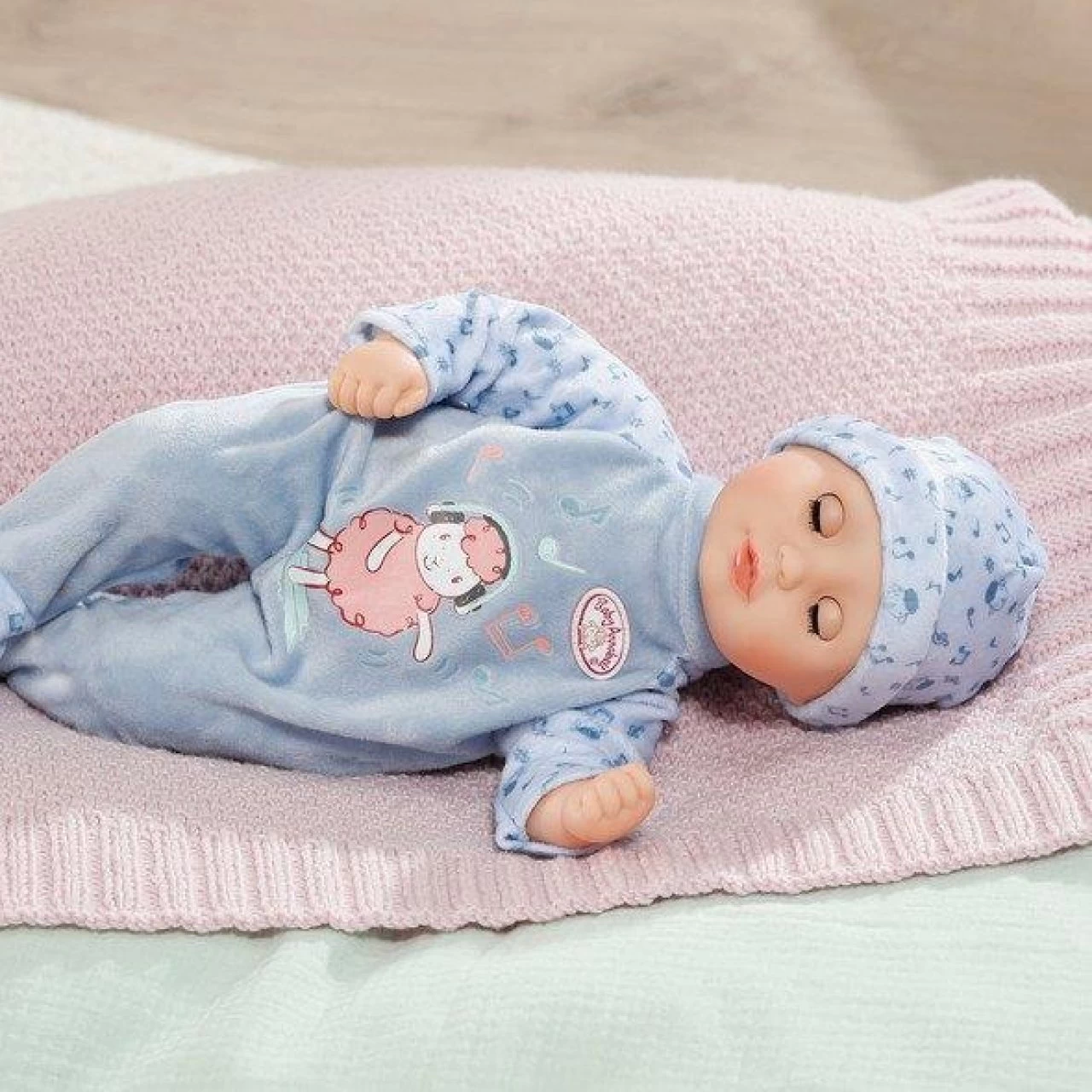 „Wenn ich groß bin, will ich Musiker werden!“ scheint das blaue Outfit des 36cm großen Alexanders zu sagen. Das aufgedruckte Schaf tanzt mit Kopfhörer auf der Wolke zwischen Noten. Auch die Füßchen, die Ärmel und die Mütze sind mit süßen Noten-Grafiken bedruckt. Der Onesie ist im easy fit Style gefertigt und kann sogar von kleinsten Kinderhänden einfach an- und ausgezogen werden.