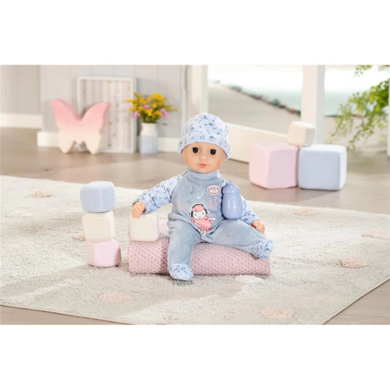 Die Puppe mit weichem Stoffkörper bringt ein Fläschchen für erstes Rollenspiel mit.