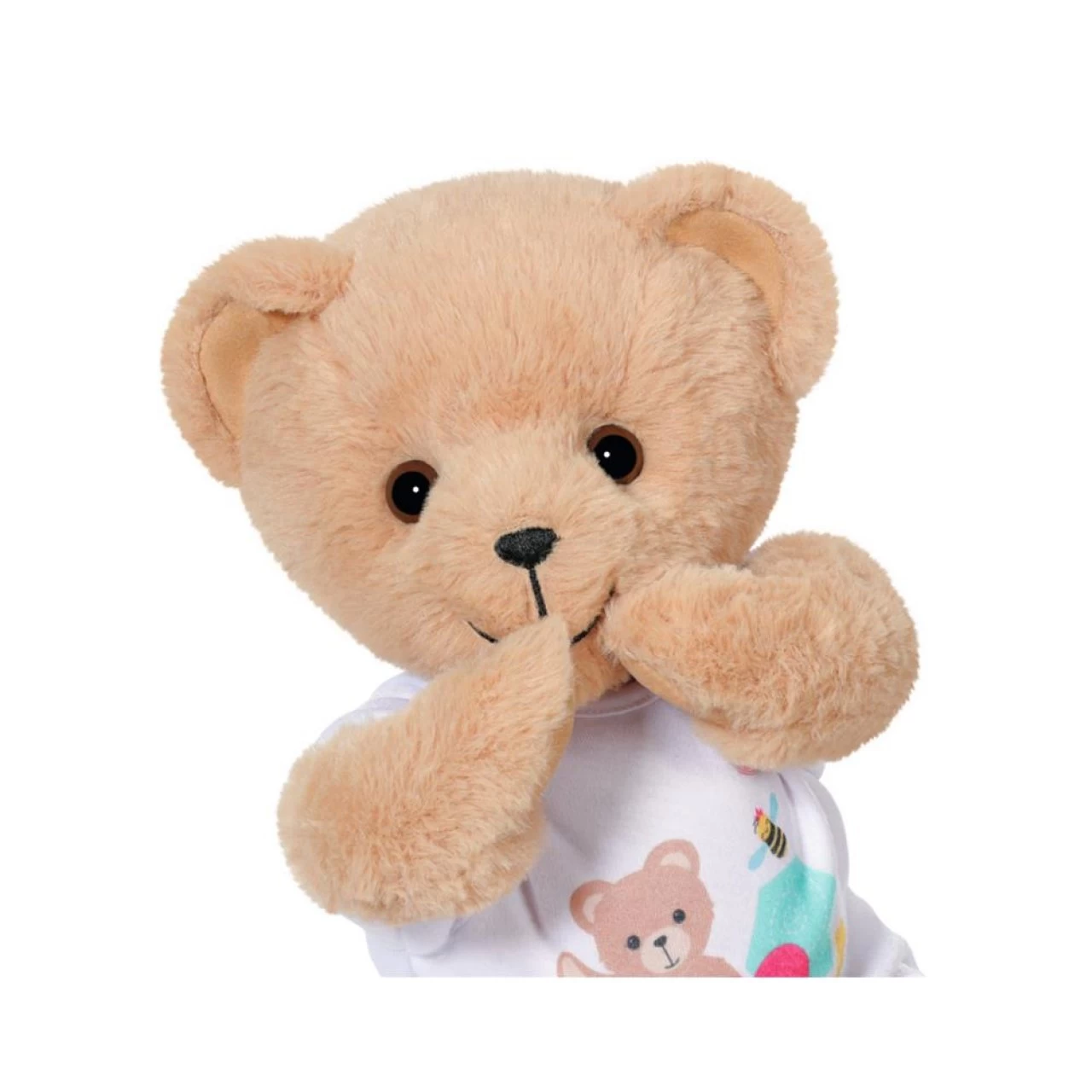 Der kleine Bär mit dem süßen Lächeln hat einen weich gestopften Körper. Zu seiner Erstausstattung gehört ein weißer Strampler. Er hat eine eigene Fashion-Kollektion und bärige Accessoires, kann aber auch fast alles von BABY born anziehen und das Zubehör benutzen. Seine Figur ist so gestaltet, dass ihm nahezu alle Kleidungsstücke von BABY born 43cm passen. Nur die Schuhe, die passen ihm nicht. Aber welcher Bär braucht schon Schuhe? Durch die beweglichen Arme und Beine sowie den drehbaren Kopf, kann er einfach an- und ausgezogen werden. Seine Mobilität ist perfekt für vielfältiges (Rollen-)Spiel. Wer darf sich wohl als Erste*r ins Freundschaftsbüchlein mit extra Stickerbogen eintragen?
